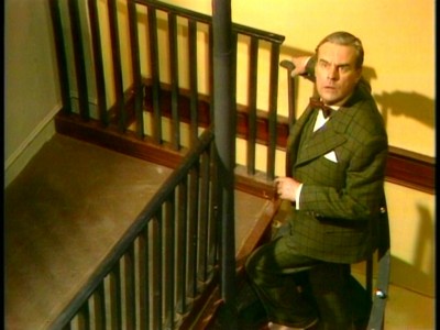 As well, it's always great to see Glyn Houston back as Lord Peter's manservant, Bunter. Houston and Carmichael have an easy chemistry between them that never veers into broad comedy, but which suggests a bemused attachment that's rooted in true friendship, regardless of class restrictions (in the following movie, their backstory is dramatized). Indeed, part of their appeal to each other seems to stem from that division, with Bunter pleased that the friendly Lord Peter is a will-o'-the-wisp adventurer and not an indolent aristocrat, while Lord Peter is continually impressed with the skills and arts that Bunter has mastered. It's an egalitarian arrangement that's at once inexplicable and transcendent (they are separated by class, and they do "know" their places...but still they operate largely as equals, with appreciation coming from both sides). There are quite a bit of scenes between the two fine actors here, many of them lightly amusing (I particularly like Wimsey's shock at the reticent-but-proud Bunter's assertion that he's a fair painter, along with his many other talents), but the one moment in the entire film that stood out for me was an all-too-brief shot of Wimsey, tucked back into a quaint little dining room in his Scottish cottage, as he silently contemplates his fine wine and the wonderful dinner made for him by the talented Bunter. It's a quiet, evocative moment for a character who's usually bounding around, bursting with energy and sarcastic wit, and as always, Carmichael essays it beautifully.