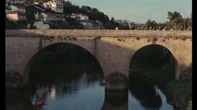 Our Beloved Month of August is thus an inclusive film, much more so than is common, with a patient pace and tone throughout that's redolent of all the generosity and even warmth that that term implies. And it's not just the ingenious sound design that's discreetly complex, often holding more layers than expected; the film is a visual delight too, always "on" and reflecting an open, exquisite sensibility on Gomes's part, so that what we see -- whether spontaneous-feeling, handheld/direct-cinema style views of a majestic, ritualistic religious parade; the same parade with figures tiny as ants as seen from a gorgeously composed, very wide static shot as it crosses Agranil's ancient Romanesque bridge; magically silhouetted close-ups of characters; or de-centered, anonymity-underlining, Antonioni-like views that miniaturize and de-emphasize characters in precisely composed shots that place them against sweeping, imposing architectural or natural backdrops -- is always as inventive and inspired as it is technically "meager." Indeed, the film makes a virtue of necessity; it may have been shot on 16 mm (by the supremely talented cinematographer Rui Poças, To Die Like a Man) and then blown up via a digital intermediate process to 35 mm, for a grittier, blurrier overall effect than standard 35 mm shooting, but what could have been a technical limitation or obstacle becomes instead the opportunity to explore possibilities of lighting and framing, and Gomes and Poças come up with a variety of eye-catching images that make the film a virtually nonstop visual treat. Their camera's way of taking in the film's world runs the gamut from playful to somber, from gritty/shaky framings and compositions to sublimely elegant ones, always ready to turn on a dime and ensure that we miss as few potential ways as possible of experiencing these surroundings, this culture, and these people. With a mind as enthusiastically curious and a visual sensibility as free-spirited and ravishing as Gomes's guiding us along, initially giving us just enough crumbs to keep us hanging on through what at first appears to be the film's morass before slowly, incrementally, almost unnoticeably savoring the pleasure of revealing its refreshingly creative, unfamiliar shape, Our Beloved Month of August accrues a singular power to overload and short-circuit your cinematic pleasure centers and distinguishes itself as one of the fleetest, supplest, most adventurous and uncategorizable films to appear on the DVD-release radar in a very long time.