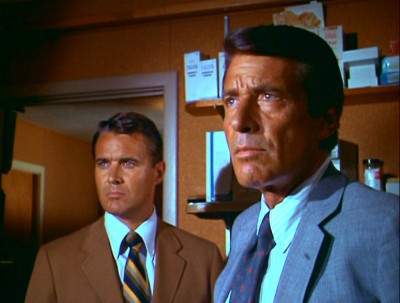 Solid performers Tom Skerritt, Fabian (yes, that Fabian), and fav Woodrow Parfrey (not at all amusing in this outing) put Unknown Victim across in this kidnapping-gone-wrong story that benefits from a suspenseful cat-and-mouse finale in a decrepit movie palace. The Stalking Horse is a reliable industrial/international espionage entry, with Steve Forrest (always better playing flawed, pressured characters) doing well as an executive whose mistress, Diana Hyland, is in league with the Rooskies. Center of Peril gets an immediate jolt of energy from the vicious, violent undercurrent Vic Morrow always brings to his roles--this time, he's a middle man for art thieves Gary Collins and Susan Howard (did Morrow ever play any light comedy roles???). Zimbalist, Jr. gets to go undercover in this one, posing as an art expert, generating a nice bit of suspense at the end as we wonder if he'll pull off the ruse. Director Virgil W. Vogel scores with another solid actioner, Eye of the Needle, where famous surgeon Richard Kiley, hiking in the Oregon wilderness before a failed kidnapping plot leaves him wounded and on the run, has to fight back against his pursuer (plenty of smart detail in this rugged entry). The Fatal Connection is another admirable B noir that The FBI does so well, with Dana Elcar and Sorrell Booke stealing the show as conspirators in a complicated story about a crusading columnist (Andrew Duggan) and the snitch who will get him killed (Scott Marlowe brings some Method-y touches to his jumpy role as a would-be assassin). And in The Replacement, The FBI is dragged into the 70s when Zimbalist, Jr. dons a porn-worthy 'stache for his undercover role as a Soviet intelligence officer in an enjoyably convoluted Cold War thriller featuring good performances from Charles Korvin and Phyllis Thaxter (yes...Superman's mother is a Commie pinko spy).