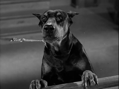 I have to write that even though there have been problems over the years with some of Fox's Cinema Archives releases in terms of their later widescreen titles' aspect ratios, I love that so many older, forgotten, "marginal" Bs like It Shouldn't Happen to a Dog are getting released. Thinking back on some of these Bs that I've really enjoyed over the past few weeks, I noticed that the name "Herbert I. Leeds" was frequently popping up in the director's credit--first a couple of brisk Lloyd Nolan efforts that caught me off guard (Manila Calling and Just Off Broadway), and now this amusing, fast-paced crime comedy starring a favorite, Allyn Joslyn, and a well-trained, photogenic pooch. I don't know much about Leeds' career--from what I've read, his apprenticeship as an editor may have been key to his later speedy directorial efforts--but he's 3 for 3 with me so far, and I'll be on the lookout for more of his sharp, entertaining movies.