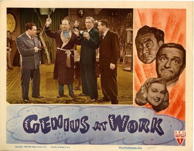 A 1942 scandal about an alleged sex orgy at Atwill's home all but ruined his career. Like Lugosi, Atwill was reduced to pitifully small roles in Universal horrors and larger ones in the cheapest of cheap films (the entertaining Fog Island, for instance). Genius at Work was shot in August 1945, after which Atwill appeared in a tiny part in House of Dracula, followed by a serial, Lost City of the Jungle. Atwill died of cancer and pneumonia in April 1946, midway through that film's production, and Genius at Work wasn't released until the following October, six months after he had passed.