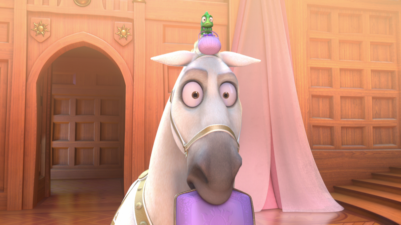 Tangled Ever After (6:29) is certainly a bit of a cynical follow-up to a big hit, tagging along with the theatrical release of Beauty and the Beat 3-D, focusing on the two animal stars of the original Rapunzel film, Maximus the horse and Pascal the chameleon, as they try to find the wedding rings for Rapunzel and Eugene on their big day. A chase scene full of coincidences and slapstick, it offers a few inventive gags and beautiful animation, making it a good update on a classic formula. No complaints about going to the well again, considering the results.
