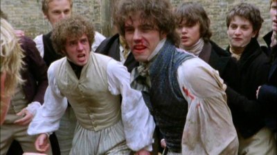 Just as a note of caution for viewers: although the DVD box carries a blurb from The Hollywood Reporter, touting this as a "family viewing experience," I would seriously question the notion of showing this film to younger audience members. The film is filled with acts of violence and cruelty directed at children, including bloody fights, whippings, and a graphic burning that may very well terrify younger children. There's also a gratuitous sex scene -- which, ironically, never appeared in the book -- that, although very brief, is inappropriate for kids. Tom Brown's Schooldays is not for young audiences.
